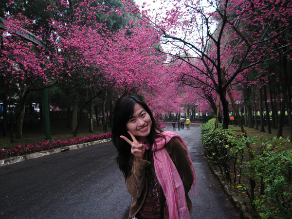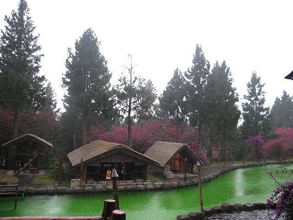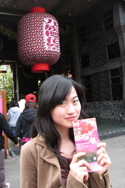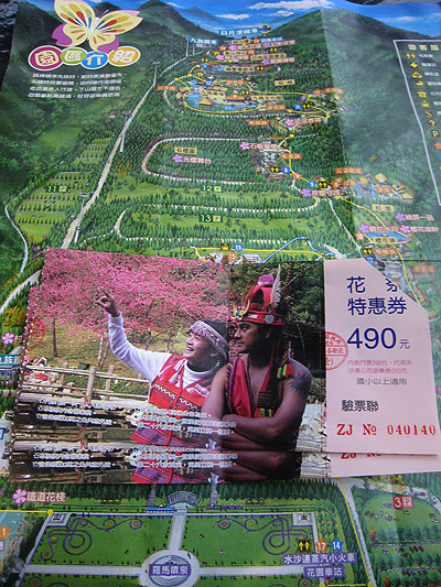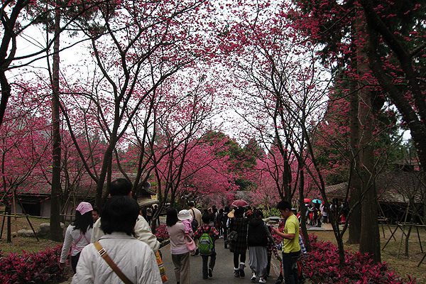 因為也沒辦法賞櫻,我們只好到歡樂世界,回味太空山、單軌電車這種不淋雨的娛樂。4點就到了文化廣場等待半小時後即將上場的《迎賓歡送會》,此次的九族文化村之旅相當捧場,看了好幾場原民的節目。節目結束後,外頭雨也停了。我們走回櫻花道上,趁著還有點日光照一點相。