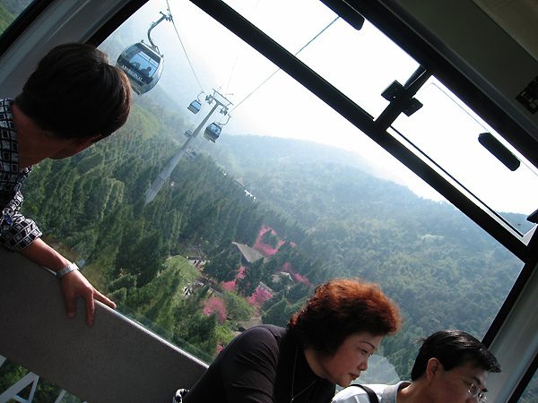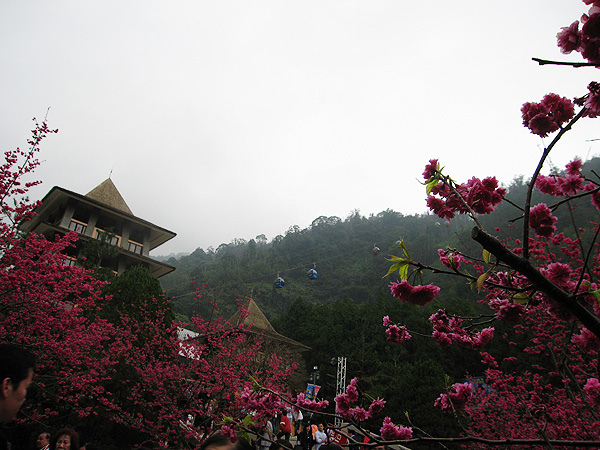 坐在好高好高的纜車上,沒多久,有懼高症的我就開始癢癢了。從纜車俯瞰九族文化村,桃紅色的櫻花叢叢點綴在蔥鬱的樹林間,平常盯螢幕太久,很需要這樣養眼的景色。