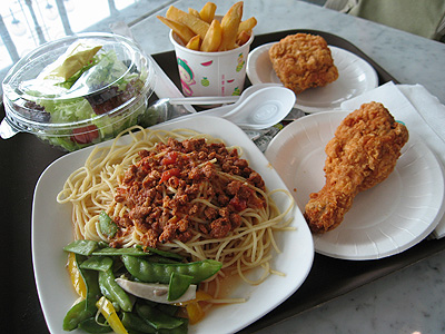 沙拉60元、黃金薯條60元、炸雞60元、炸雞腿60元、肉醬義大利麵120元,兩人總共360元。我們隔壁桌有一家人,小孩的份量居然跟我們兩人加起來一樣。東西是沒有很難吃,但沙拉水沒瀝乾,醬給得不夠大方;義大利麵肉醬是罐頭的,沒什麼味道;地瓜薯條相對來說還不錯,若有提供梅粉更好;炸物還OK。