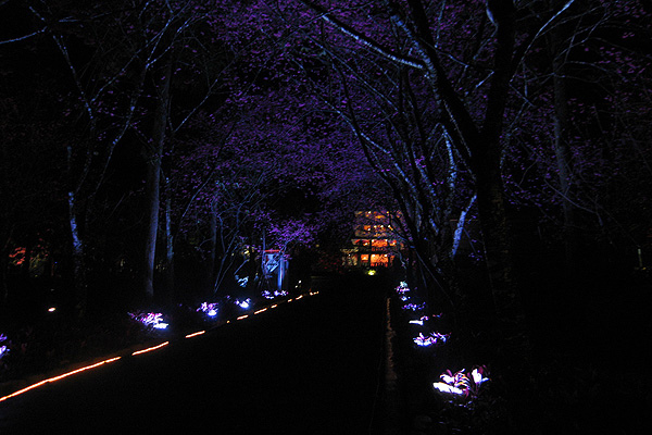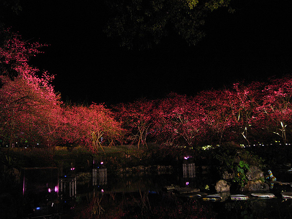 在這邊有放古典樂,燈光會隨音樂作變化,「古典交響樂在夜空與櫻花共舞的幻境,讓遊客深刻地留下一個值得在生命中反覆咀嚼、眷戀的夜櫻劇場」(摺頁上說的)。走到這邊剛好也腿痠了,是個非常適合稍做休息的地方。(感覺我跟阿腫好像在進京趕考一樣)