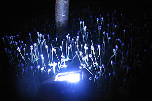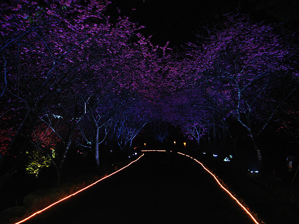 因為要等夜櫻,所以開了豆干解解饞,順便減輕我袋子的重量。等到大概5點多的時候開始打燈,地圖上有夜櫻八景,但我們已經在最低處了,只能走到伴有音樂的情人光廊還有色彩變化萬千的櫻花彩虹。