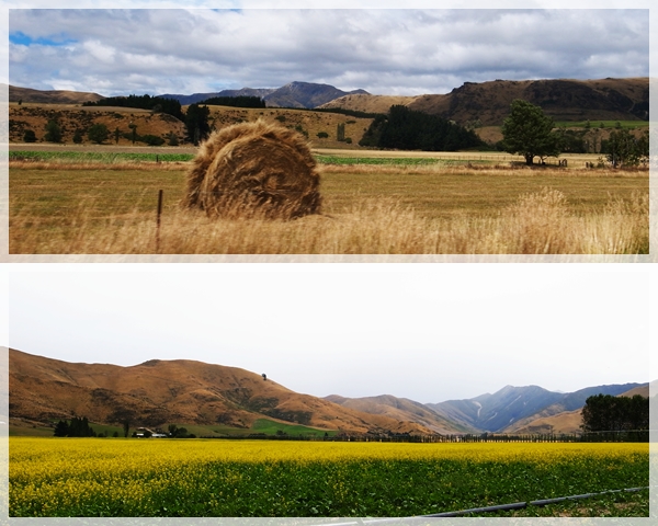 (上- 孤單的牧草捲。下- 天氣開始不好,但滿片黃花還是吸引我們下車拍照了。)