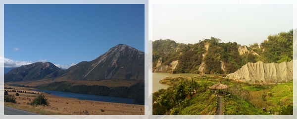 (左- 我傳給米在紐西蘭的照片。右- 米傳給我初二大家去牛埔泥岩的照片,說紐西蘭的山跟台灣的滿像的。在小螢幕上看起來還真的滿像的XD)